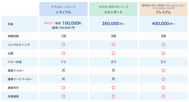 ご要望や条件にあわせた料金プランをご用意しております。「まずは試してみたい」という方に向けて、『今だけ!初回100,000円プラン』をご提案しております。ぜひこの機会にご相談ください。