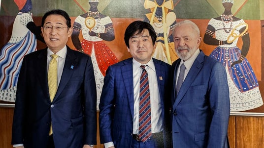 右から:ルーラ大統領、アルム代表・坂野、岸田首相