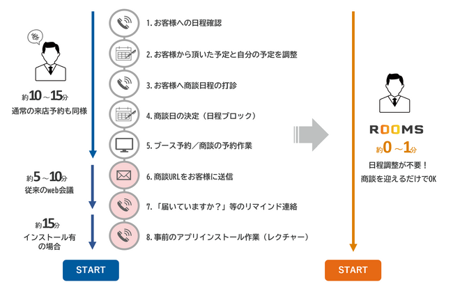 「ROOMS(ルームス)」は、国産のオンライン接客専用システムです。ZoomやTeamsといった海外産のWeb会議ツールとは異なり、日本の接客シーンに特化した機能・おもてなし要素を豊富に搭載しております。