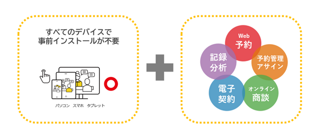 4拠点同時接続/名刺お渡し/デスクトップ共有/プレゼンモード/トークスクリプト/資料の受け渡し/ステルスメモ/音声自動議事録/チャット/ファイル送信/自動リマインドメール/Outlook・Googleカレンダー連携/背景ボカシ/商談履歴/HPとのカレンダー連携/お客様からの予約受付/担当アサイン/自社ロゴへの差し替え/録音録画/アンケート/スマホ・タブレット対応/ルームキー接続/Salesforce連携/アクセス解析タグ(Googleアナリティクス、Googleタグマネージャ)設定機能/ダイレクトコール(即時接続)機能/表情・発話分析機能/WebRTC技術(アプリなしのブラウザ通信)での10拠点同時接続機能/リアルタイム電子契約機能、など