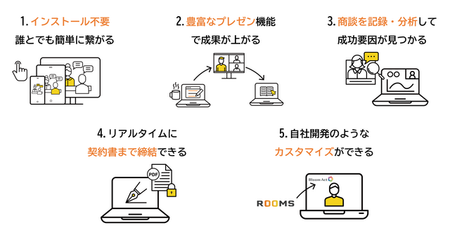「ROOMS」にはBtoCのオンライン商談に特化した機能が豊富に搭載されており、専用アプリのインストール不要でお客様と接続でき、日程調整もカレンダー予約機能で簡略化。電子契約システム機能によりオンライン商談中に契約締結も可能。国産のサービスならではの「おもてなし」をコンセプトに作られた機能で、店頭の相談窓口と同等のサービス価値と安心感を提供できます。