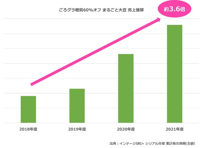「ごろグラ 糖質オフ」シリーズは、レギュラー品の「ごろグラ」に比べて糖質をオフした健康志向のグラノーラです。2018年にシリーズ1品目「まるごと大豆」の発売を開始し、特に2020年以降伸長が加速。現在もその勢いはとまらず2021年度の売上は2018年度比で約3.6倍になりました。2021年には、人気フレーバー「チョコナッツ」の糖質オフ商品を発売し多くのお客様にご好評をいただいています。