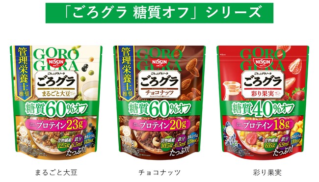 今回、本シリーズから「ごろグラ 糖質40%オフ 彩り果実 300g」を新発売します。2014年の「ごろグラ」シリーズ発売当初から続く人気フレーバー「彩り果実」のおいしさはそのままに、気になる糖質を40%オフ*。さらにプロテイン、食物繊維、鉄分、カルシウムをしっかりととることができます。「まるごと大豆」「チョコナッツ」に加え、新しくなった3種のバリエーションで、“我慢せずにおいしく健康志向な食事をしたい”という方の毎日の健康をサポートしていきます。