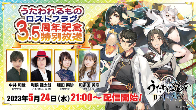 株式会社アクアプラス(以下アクアプラス)は、スマートフォン用RPG『うたわれるもの ロストフラグ』の3.5周年を記念した特別番組を、2023年5月24日(水)21時より配信することを決定いたしました。