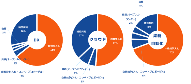 昨今、注目の集まる「DX」関連が公示案件数1位に浮上。一方、落札金額では、「クラウド」や「IoT」、「業務自動化」などシステム系の案件が上位に。