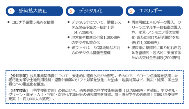 本年度の国家予算は、令和3年度補正予算と一体として、新型コロナ対策に万全を期しつつ、「成長と分配の好循環」による「新しい資本主義」の実現を図るための予算、という特徴が大きくみられます。