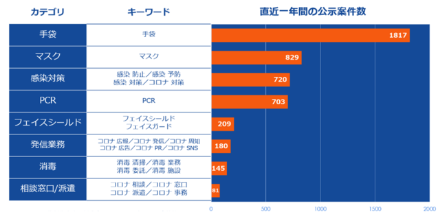公示案件数は「手袋」が1,817件と1位に。落札金額では、広報業務や広告などの宣伝事業が1位、次いで窓口や派遣業務、消毒作業などの人材案件が2位、3位と続いた。