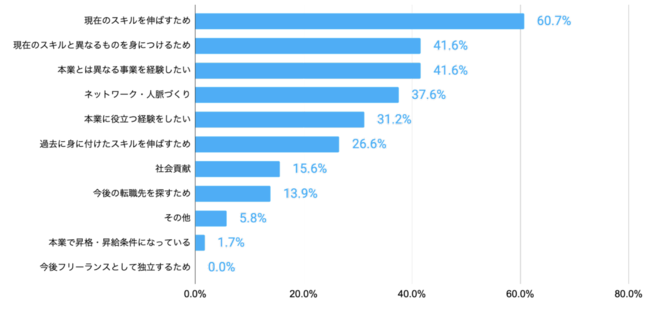 副業の目的(報酬以外)として、「現在のスキルを伸ばすため(スキルアップ)」という回答が最も高く60.7%、ついで「現在のスキルと異なるものを身につけるため(リスキリング)」が41.6%
