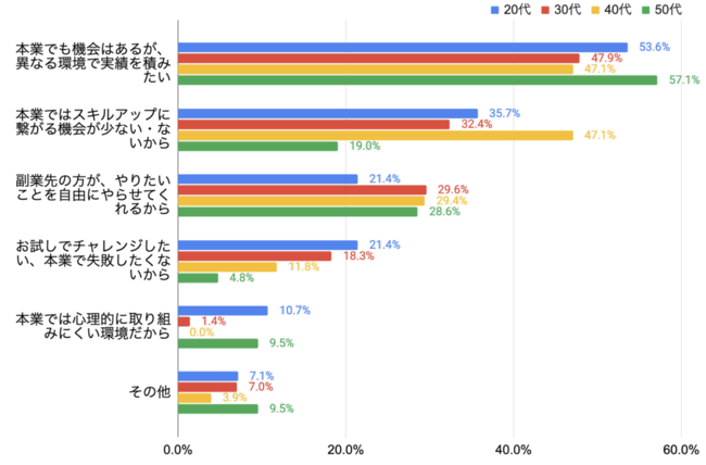 2.副業に設問1の目的を求める理由として「本業ではスキルアップに繋がる機会が少ないから」は、40代の割合が最も高く47.1%