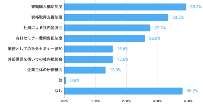 本業でのスキルアップの支援について、「特にスキルアップ支援制度がない」という回答の割合が2番目に高く38.2%