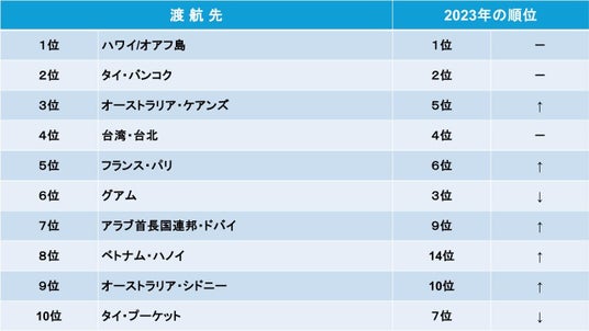 年末の海外渡航先として王道のハワイのほか、長引く円安の影響もあってか、タイや台湾をはじめとするアジア諸国やオーストラリア2都市がランクアップする結果となりました。