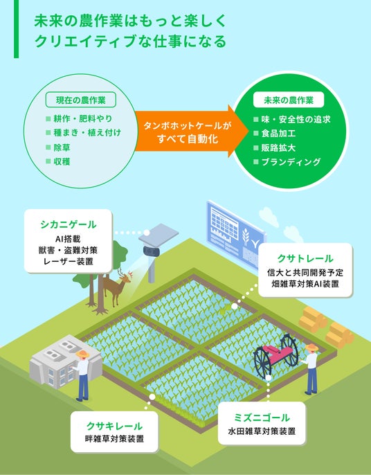 最終的に、同社は時間と労力がかかる農作業を自動化したロボット「タンボホットケール」を提供する計画です。それが実現した未来では、農業従事者の仕事はよりクリエイティブなものになり、味・安全性の追求や食品加工、販路拡大、ブランディングなどの仕事が拡大すると考えています。