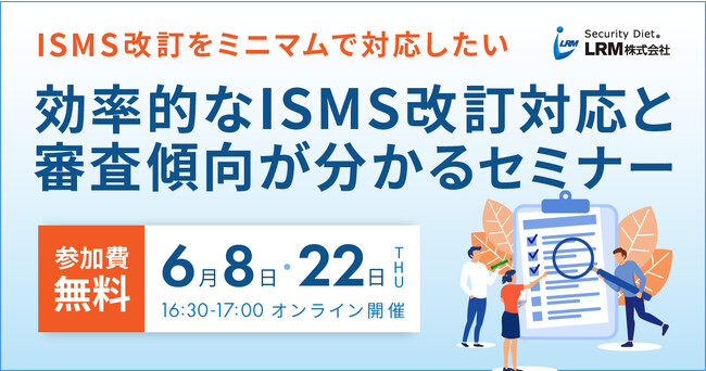 LRM株式会社(以下 LRM、本社:兵庫県神戸市、代表取締役CEO:幸松哲也)が、2023年6月8日(木)・6月22日(木)の2日程において、「効率的なISMS改訂対応と審査傾向が分かるセミナー」を開催いたします。