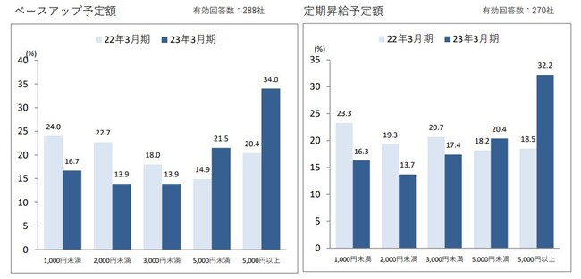 特に、製造業は61.8%(前年比+4.3ポイント)、建設業は44.4%(前年比+0.6ポイント)、運輸業は37.8%(前年比+5.5ポイント)となり、賃上げに積極的な企業が増加しています。また、ベースアップ予定額は「5,000円以上」34.0%(前年比+13.6ポイント)、定期昇給予定額は「5,000円以上」が32.2%(前年比+13.7ポイント)となり、金額ベースでも苦渋の決断をしていると思われます。