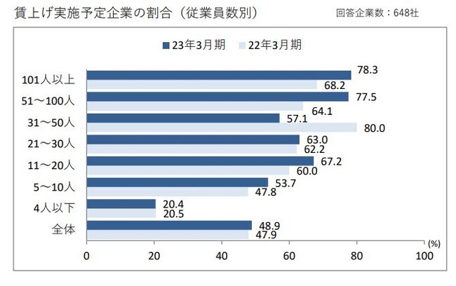 賃上げを「実施する」は48.9%と前年調査から1.0ポイント上昇しました。業績が十分に回復していない現状でも賃上げを取り組まざるを得ないのが実情です。