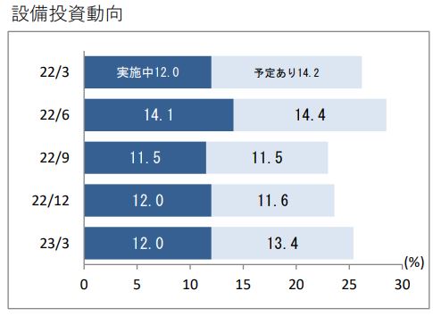 設備投資は、総合では「実施中」が12.0%(前回比±0.0ポイント)、「予定あり」が13.4%(前回比+1.8ポイント)で合計25.4%となり、業況回復への期待を背景に堅調に推移しています。