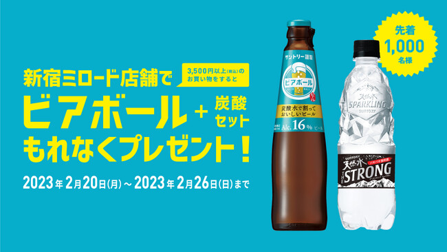 このたび「新宿ミロード」では、20歳以上のお客さまへ、日頃の感謝の気持ちをお伝えするとともに、いま話題の新商品をご体験いただく機会を提供するべく、サントリーとタイアップしたプレゼントキャンペーンを企画。期間中、対象店舗で3,500円以上(税込・合算可)のお買い物やお食事などをしていただいた先着1,000名さまへ、サントリーの新ビール「ビアボール」(334ml 1本)と炭酸水(510ml 1本)をセットでプレゼントいたします。