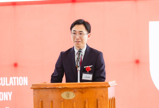 式典では土橋直樹学部長からの式辞のほか、運営母体である株式会社エスアイイーの藤正幸社長からの祝辞、提携するエセックス大学のアネシー・ラックス博士からのビデオメッセージを上映しました。