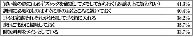 実際に取り組んでいる時短家事では、「買い物時間短縮のためのストックの確認とメモ」が41.3%となり、節約にも結びつくことからか最も多くなっています。続いて調理時間の短縮のため「調理器具は手の届くところに置いておく」が40.4%、「ゴミは家族がそれぞれ分別する」が38.2%となっています。