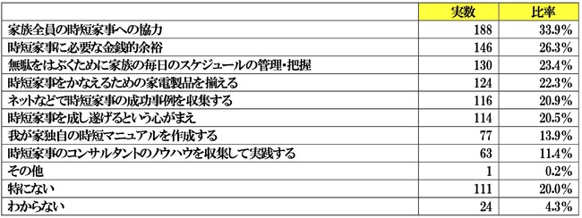 時短家事を成功させるためには、やはり「家族全員の時短家事への協力」が最も多く33.9%。続いて「時短家事に必要な金銭的余裕」が26.3%となり、ある程度の家計の出費もやむを得ないと思っていることが伺えました。また「無駄を省くためには家族のスケジュール管理も必要」が23.4%、「時短家事のため家電製品を揃える」が22.3%となっています。時短家事については、ネット上などで多くのノウハウが紹介されています。それらを参考にするとともに、自宅の状況に合わせて、カスタマイズすることも成功の秘訣と思います。