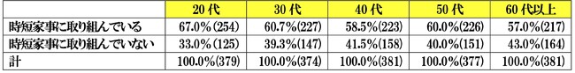 ● 時短家事に取り組んでいる20代が67.0%、30代が60.7%と平均以上になる(事前調査から)