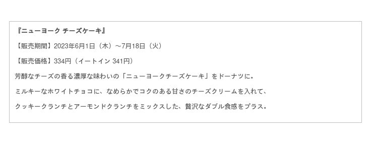 『ニューヨーク チーズケーキ』は、しっとりとした食感と、チーズの濃厚な味わいが特徴の「ニューヨークチーズケーキ」をドーナツにしました。なめらかでコク深いチーズクリームを詰めた生地に、ミルキーなホワイトチョコをコーティング。食感が楽しいクッキークランチとアーモンドクランチをダブルでトッピングすることで、贅沢な味わいに仕上げています。
