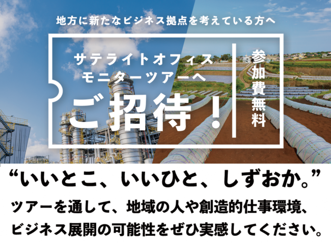 ※本モニターツアーは、静岡県へのサテライトオフィス開設の促進とともに、静岡県が運営するホームページ「サテライトオフィスしずおか」のコンテンツ充実を目的に実施するものです。モニターツアーの様子や参加企業の声などを「サテライトオフィスしずおか」に随時掲載しますので、ぜひご覧ください。