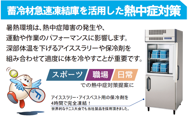 暑熱環境は、熱中症障害の発生や、運動や作業のパフォーマンスに影響します。そこで深部体温を下げるアイススラリーや保冷剤を組み合わせて適度に体を冷やすことが重要となります。通常の冷凍庫だと1晩で完全凍結させることが難しいアイススラリーや保冷剤ですが、《蓄冷材用急速凍結庫》を使用することで短時間凍結させることができ、スムーズで安全な大会運営に貢献しております。