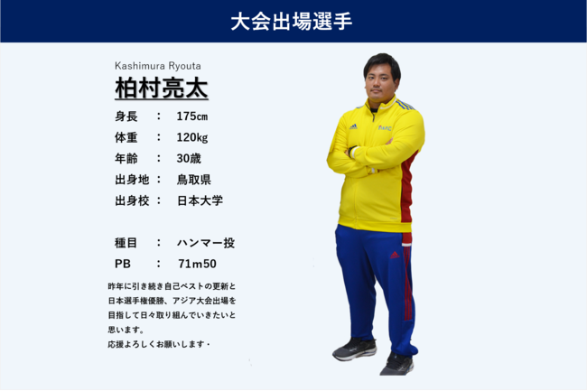 昨年の日本グランプリシリーズ、第36回静岡国際陸上競技大会(静岡県)では、71m12の記録で優勝している柏村選手は今年の日本グランプリシリーズでも優勝を狙います。