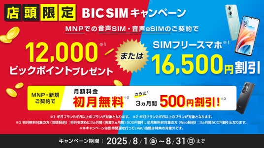 さらに、ビックカメラグループ店頭でのお申込み限定で、ビックポイントが最大12,000ポイント還元される「[店頭申込み限定]BIC SIMキャンペーン」も実施いたします。
