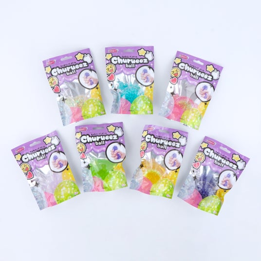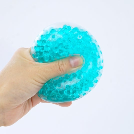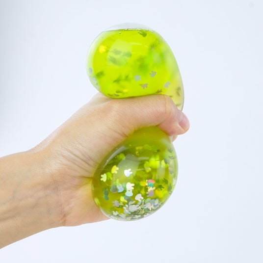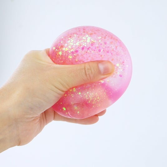 感触にくわえ、握ると中のキラキラやつぶつぶが動くおもしろい商品です。