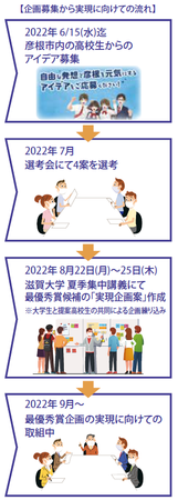 高校生によるアイデアを、滋賀大学学生が講義の中で高校生(企画者)とコミュニケーションを取りながら具体的な実現へ向けて企画立案し、最終的に選考された企画の実現を、本プロジェクトでサポートします。