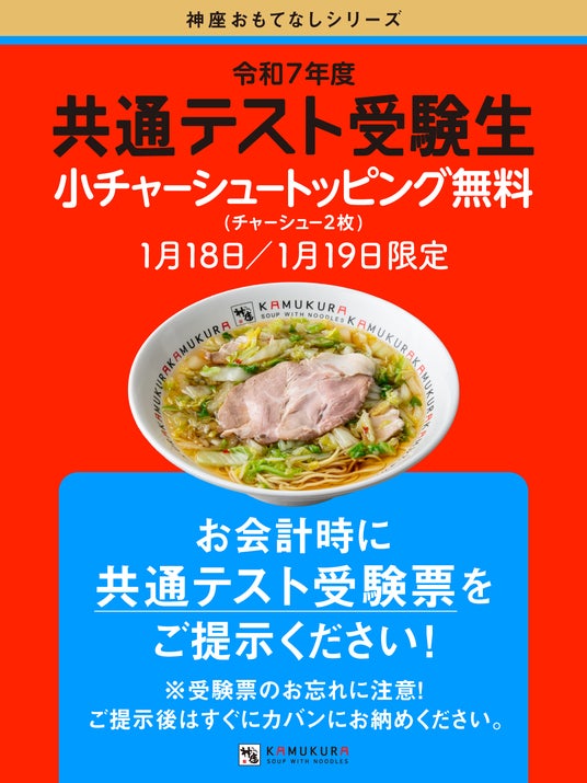 株式会社理想実業(所在地:大阪府大阪市北区、代表取締役社長:布施真之介)が運営するラーメンレストラン「どうとんぼり神座」は、2025年1月18日(土)~1月19日(日)の2日間限定で「共通テスト受験生応援キャンペーン」を実施します。令和7年度大学入学共通テストの受験票を店舗でご提示いただいたお客様に『小チャーシュー(チャーシュー2枚)』をプレゼントいたします。