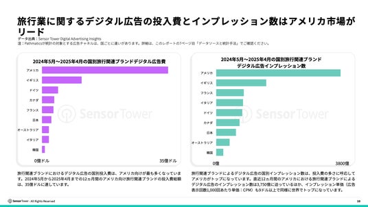 旅行業界においては、旅行関連ブランドによるデジタル広告の国別投入費はアメリカ向けが最も多くなっています。2024年5月から2025年4月までの12ヵ月間のアメリカ向け旅行関連ブランドデジタル広告の投入費総額は35億ドル、インプレッション数は3,750近く、インプレッション単価(広告表示回数1,000回あたり単価:CPM)は9ドル以上であり、世界で最も多くなっています。