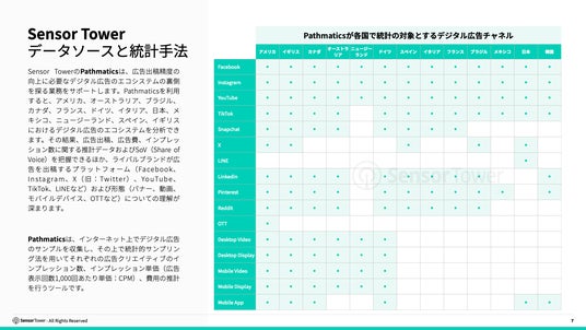 Sensor TowerのPathmaticsは、広告出稿精度の向上に必要なデジタル広告のエコシステムの裏側を探る業務をサポートします。Pathmaticsを利用すると、アメリカ、オーストラリア、ブラジル、カナダ、フランス、ドイツ、イタリア、日本、メキシコ、ニュージーランド、スペイン、イギリスにおけるデジタル広告のエコシステムを分析できます。その結果、広告出稿、広告費、インプレッション数に関する推計データ、SoV(シェアオブボイズ)を把握できるほか、ライバルブランドが広告を出稿するプラットフォーム(Facebook、Instagram、X(旧:Twitter)、YouTube、TikTok、LINEなど)および形態(バナー、動画、モバイルデバイス、OTTなど)についての理解が深まります。