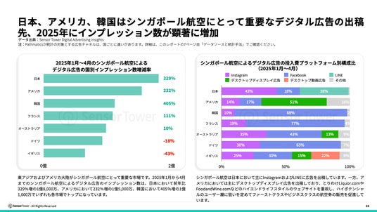 キャセイパシフィック航空を例に挙げると、2024年8月にキャセイグループはカスタマーエクスペリエンスおよび香港の国際航空ハブとしての地位のさらなる向上を目的に、今後7年間に1,000億香港ドル以上の投資を行うことを発表しました。Sensor Towerのデータによると、2025年1月から4月までに、キャセイパシフィック航空は、アメリカ、カナダ、日本、韓国、オーストラリア、ヨーロッパなど多くの地域においてデジタル広告のインプレッション数を大幅に増加させています。