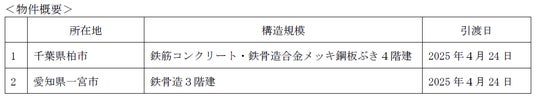 株式会社西武不動産(本社:東京都豊島区、代表取締役社長:齊藤 朝秀)は、このたび、千葉県柏市及び愛知県一宮市に所在する物流倉庫を対象資産とする信託受益権を購入するための合同会社に対して単独で不動産エクイティ投資(匿名組合出資)を実行し、対象資産の引き渡しも完了しましたのでお知らせいたします。