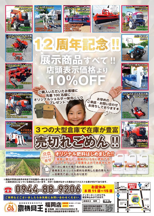 毎年周年を迎える度に実感しておりますが、12年間お客様あってこそ農機具王成り立っています。この節目に更に身を引き締め、今後もお客様に喜んでいただけるようなサービスの提供を心がけてまいります。今後とも農機具王福岡店をよろしくお願いいたします。