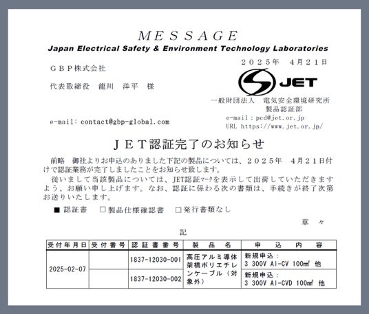 これは日本初、かつ業界初となる「高圧アルミケーブルのJET認証取得」であり、GBPの高圧アルミケーブルが革新的な技術力に加え、品質および安全性においても第三者機関による客観的な評価を受けた製品であることが証明されました。