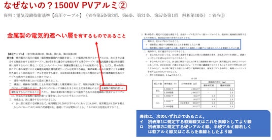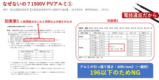 結論:電技違反だから。1500VのPVケーブルは太陽光発電所に限った特別な仕様要求となっており、導体芯線に対して高い引張強度と耐久性が要求されています。しかしアルミ導体は、引張強度が低く要求条件を確保できず、実用化には至っていませんでした。