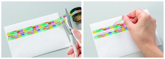 開封時のペリッパリッぺリッパリッの触感がクセになるテープ状のシール 開け方がジッパーのようなテープ状のシールで、封筒や袋の封入口に貼りジッパーを開くときのようにスライダー代わりの切り込みを引っ張ると、テープが切れて開封できます。ペリペリッという独特の音と触感もお楽しみいただけるアイテムです。切り込みの加工は