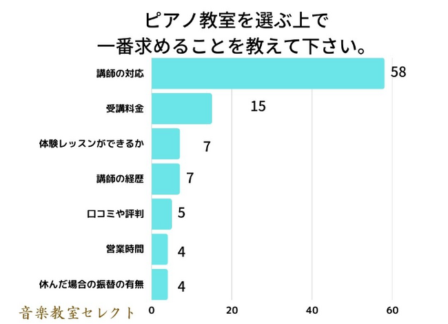 「ピアノ教室を選ぶ上で一番求めることを教えて下さい。」とアンケート調査した結果、1位は『講師の対応』でした。