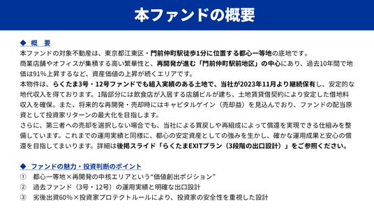 『らくたま』は、不動産クラウドファンディングをより安心で身近な資産形成の手段としてお届けするために誕生しました。私たちは安全性と透明性を常に重視し、堅実なファンド設計と多彩な特典プログラムを通じて、従来の「投資=堅い・難しい」という固定観念を取り払い、誰もが1万円から参加できる新しい投資体験を提供してまいります。