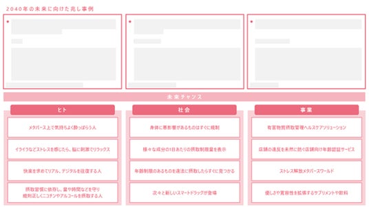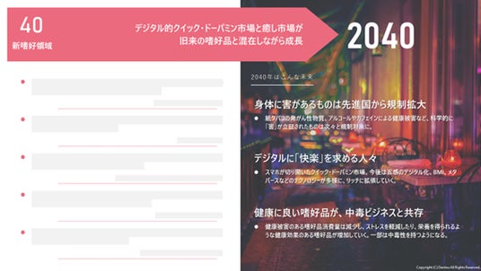 健康への悪影響が懸念される嗜好品が忌避される傾向が強まる中で、未来の快楽・癒やし・ストレス解消となる「新嗜好領域」など、昨年のリリース以降、未来のビジネスを考える際に重要と捉えた5テーマを新たに追加いたしました。