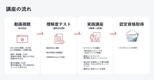 本認定資格は、昨今のキャリア採用の難度が高まる状況において、企業の事業成長のための採用力向上に寄与することを目的としています。資格を取得するためには、ビズリーチが16年にわたり培ってきた採用支援のノウハウをもとに開発した「ビズリーチ認定リクルーター育成講座」の受講が必須です。