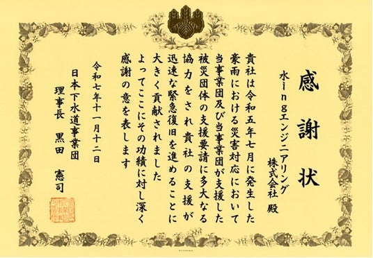 本感謝状は、2023(令和5)年7月に発生した線状降水帯発生に伴う豪雨災害において、水ingエンジニアリングが山口県美祢市内の施設(美祢市浄化センター)の浸水被害に対して、迅速な復旧対応(汚泥脱水設備、脱臭設備、用水設備等における浸水被害の確認など)に貢献した功績が称えられ、授与されたものです。