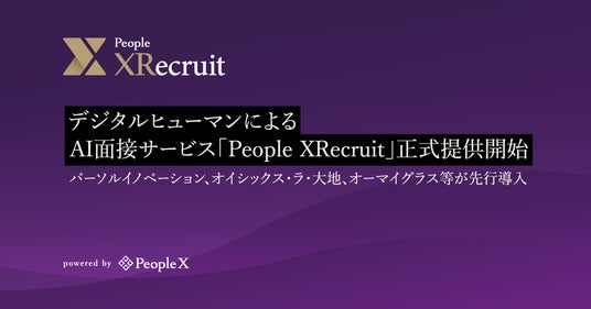 採用から活躍支援まで、AIで人事課題を解決する株式会社PeopleX(本社:東京都新宿区、代表取締役CEO:橘 大地)は、デジタルヒューマンによる対話型AI面接サービス「People XRecruit(ピープル・クロスリクルート)」を正式リリースいたします。また、パーソルイノベーション、オイシックス・ラ・大地、オーマイグラス等が先行して「People XRecruit」を導入したことをお知らせいたします。
