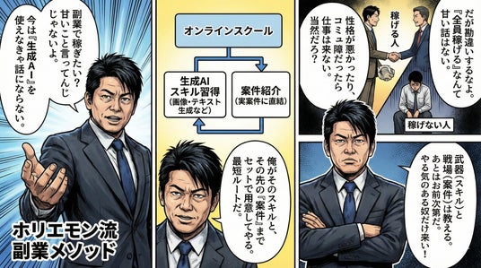ホリエモンAI学校株式会社(本社:東京都新宿区、代表取締役CEO:荒木 賢二郎、以下「ホリエモンAI学校」)は、新サービス 「ホリエモンAI副業」 を、2026年1月1日より提供開始いたします。