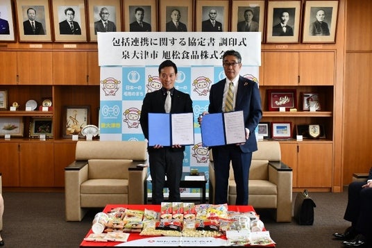 令和7年3月24日に泉大津市(市長:南出賢一)と旭松食品株式会社(本社:大阪市、代表取締役:木下博隆、以下「旭松食品」)は、こどもの健やかな成長に寄与する取組みを創出し、未来を担うこどもたちの心身の健康を支える社会の実現に向け、「こどもの食育」「こどもの保護者に対する食育への意識啓発」「和食文化の保護・継承」の3分野にわたる包括連携協定を締結しました。