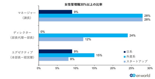 - 女性課長職比率3割以上の企業―外資系・スタートアップともに28%、日系9%で顕著な差